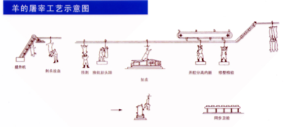 放血/預剝自動輸送線的掛鉤鉤住羊的后腿,扯皮自動輸送線的掛鉤鉤住羊的兩條前腿,這兩條自動線的速度是同步前進的,羊的腹部朝上、背部朝下,平衡前進,在輸送的過程中進行預剝皮,這種預剝的方式可有效的避免在預剝過程中羊毛粘在胴體上。